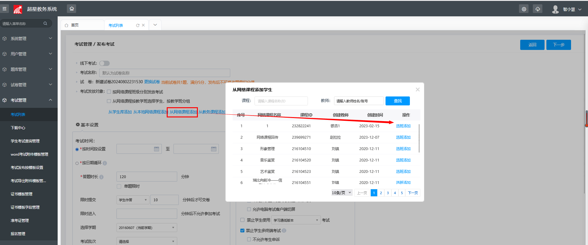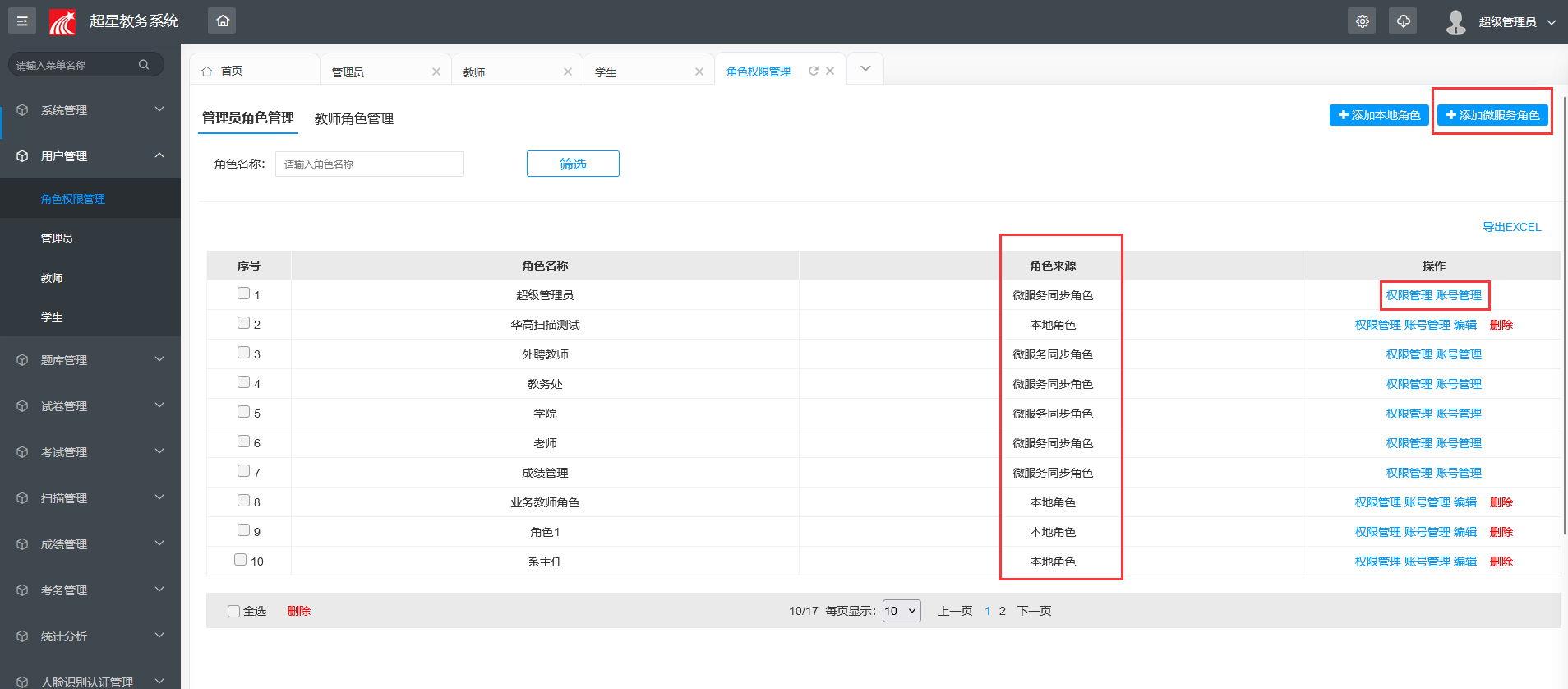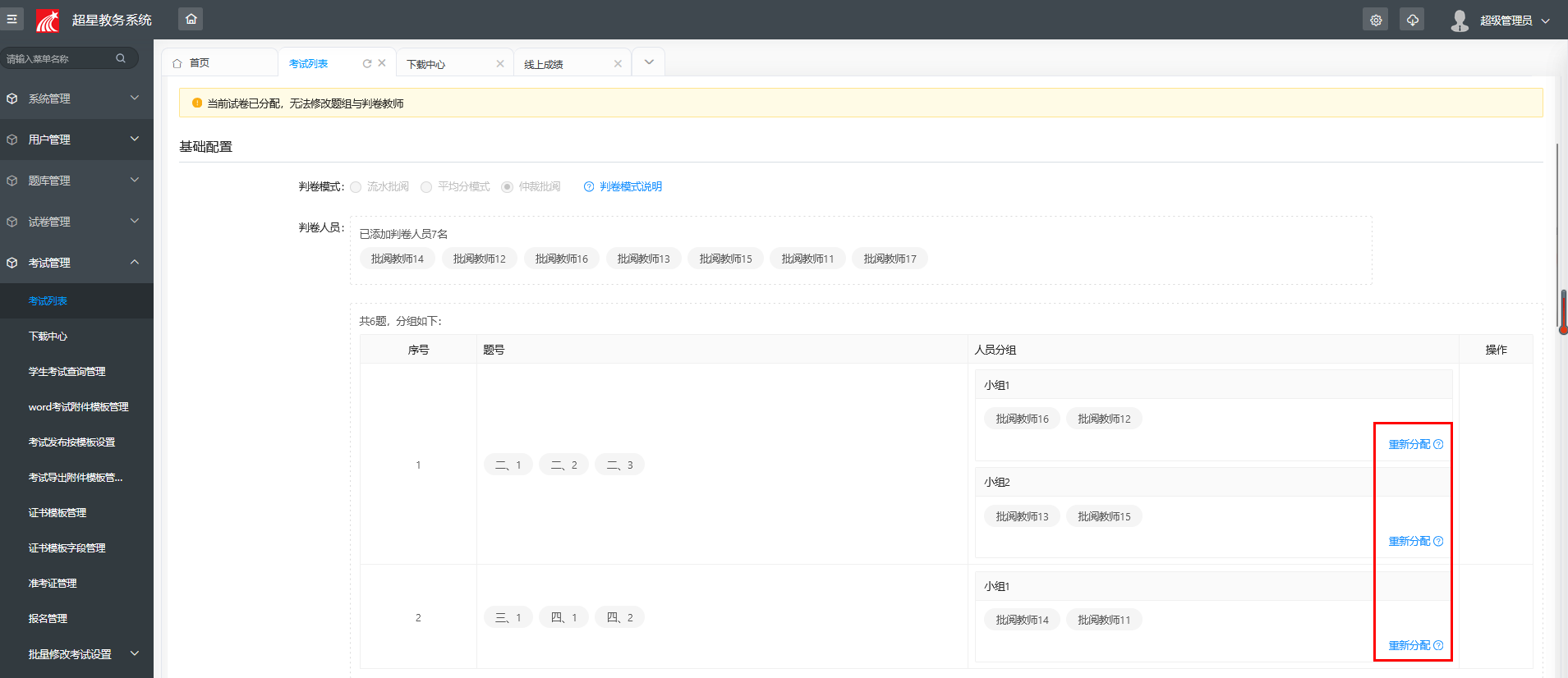 添加教师后可以设置封存、编辑、复制、发布考试、删除等管理权限。