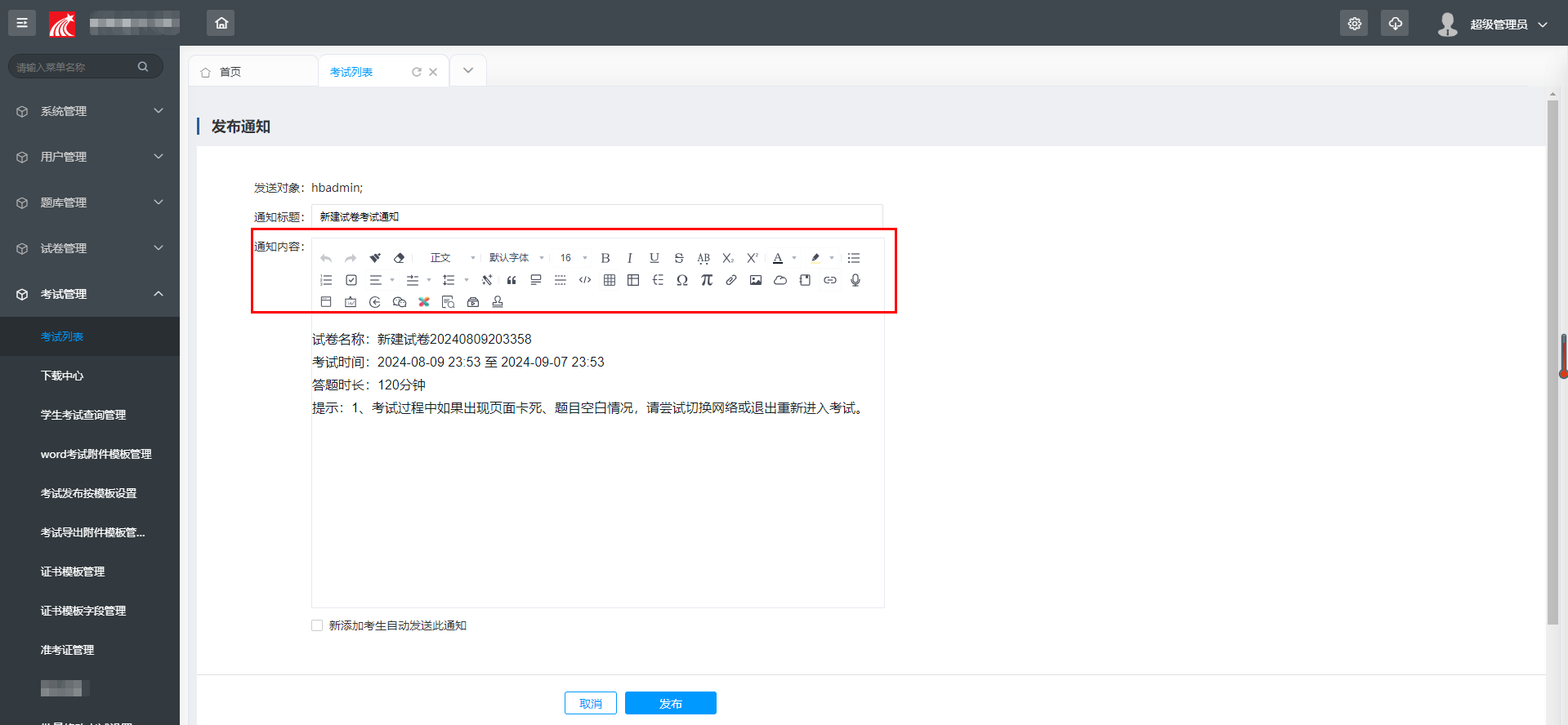 设置考试承诺书:可选择是否在答题纸上显示考试承诺书,编辑承诺书内容。