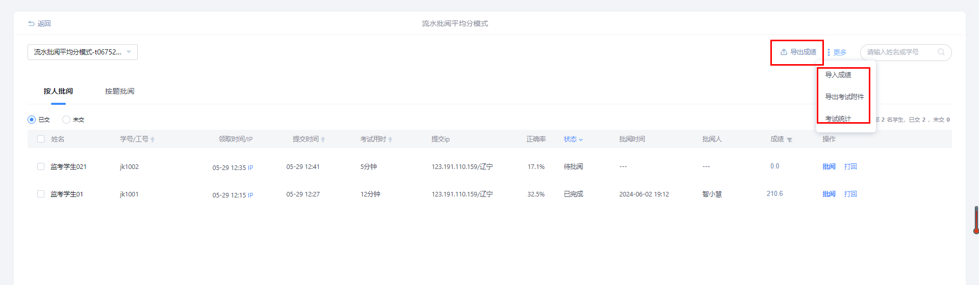 导出批阅留痕:方式一,在成绩管理中的线上成绩中查看识别结果,导出批阅留痕答题纸;方式二,在考试列表中导出批阅留痕答题纸。