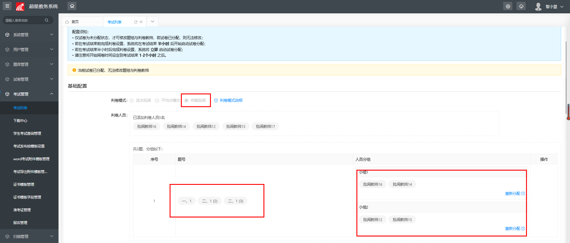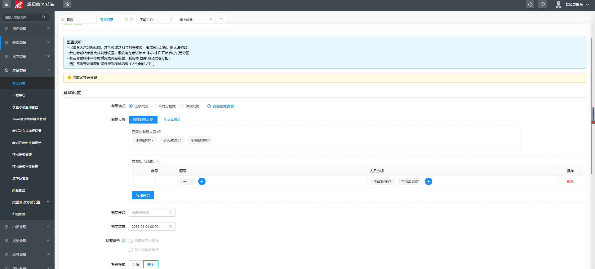 选择答题纸点击分配管理教师,添加管理教师;添加后,可对已添加的教师分配答题纸的管理权限,如答题纸的封存、编辑、复制、发布考试、删除等;拥有对应功能权限的教师才可对答题纸进行对应操作。