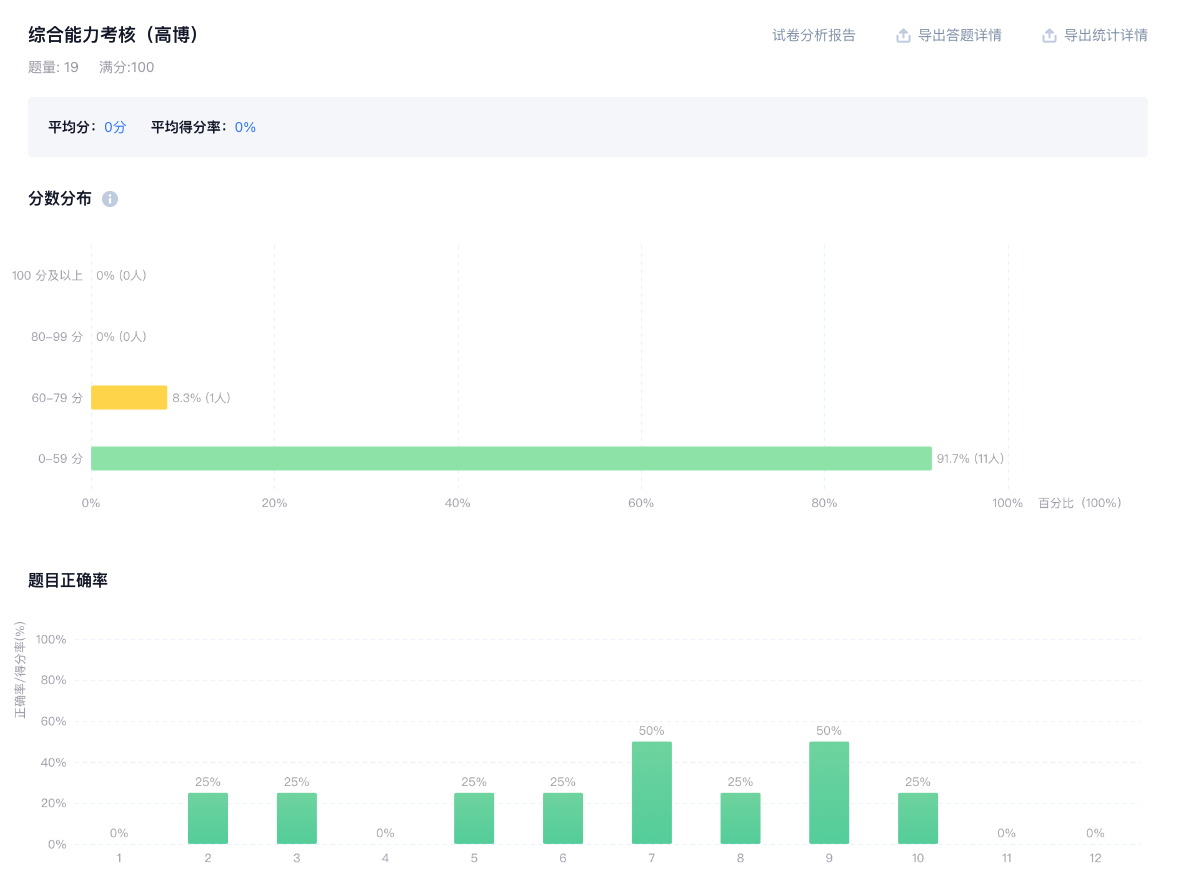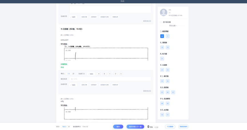 提交批阅后可查看客观题自动批阅数据,查看系统识别考生答题是否准确,对于主观题已阅后可查看主观题批阅教师、批阅分值、批阅时间。