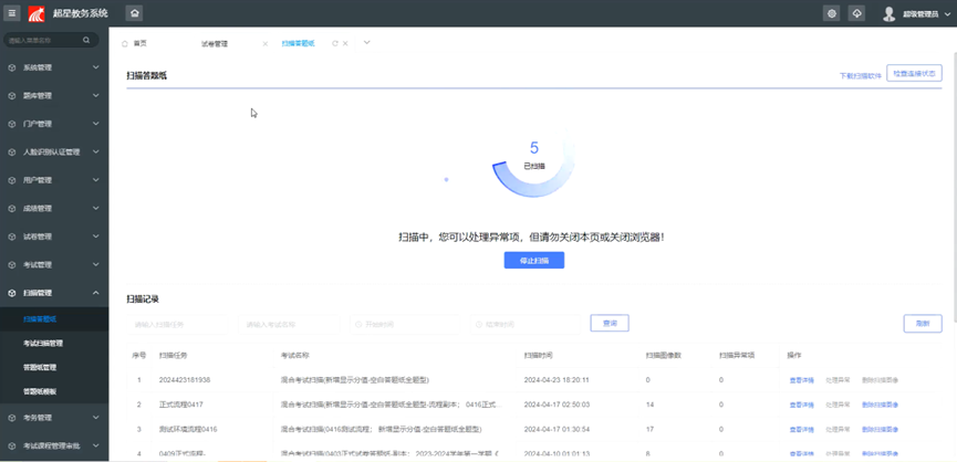 管理员可在【考试扫描管理】中查看各线下考试答题纸的状态,包含已扫描识别考生答题纸的统计,与未匹配考生的图像情况,并处理识别过程中发现的异常项、查看考生答题纸、查看识别结果。