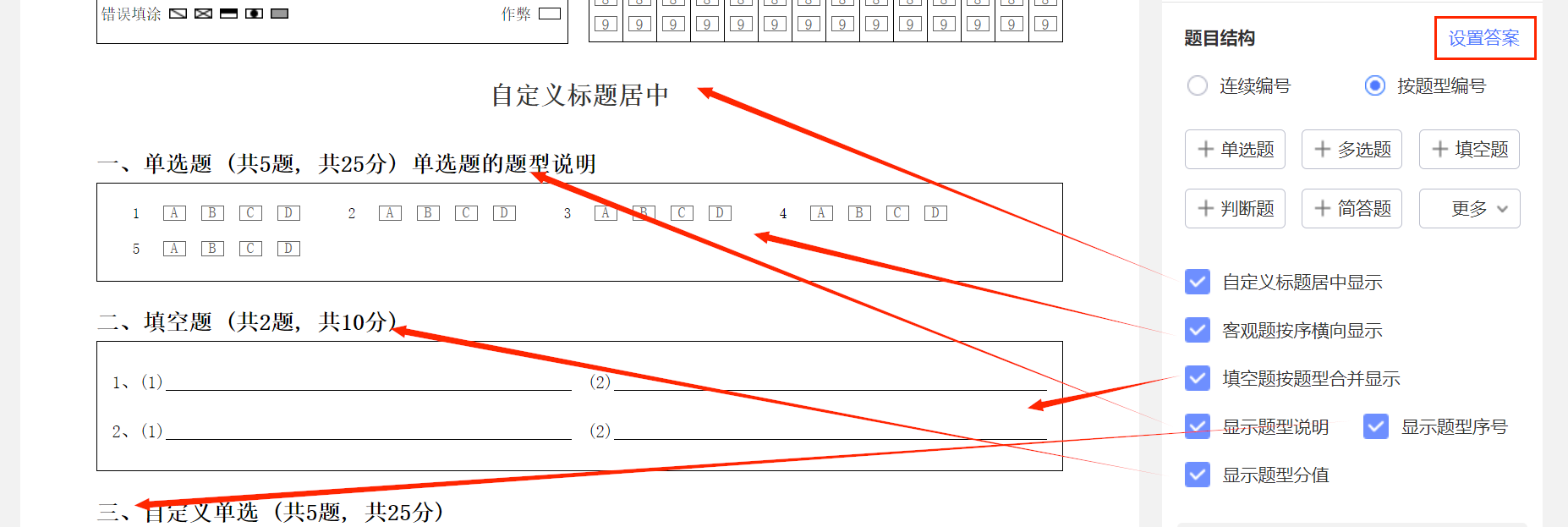 添加/编辑试题:可设置题目结构,选择试题按题型编号或连续编号;可添加、编辑移动、删除试题,题型包含单选题、多选题、填空题、判断题、简答题、阅读理解题、完形填空题,可自定义添加新题型。